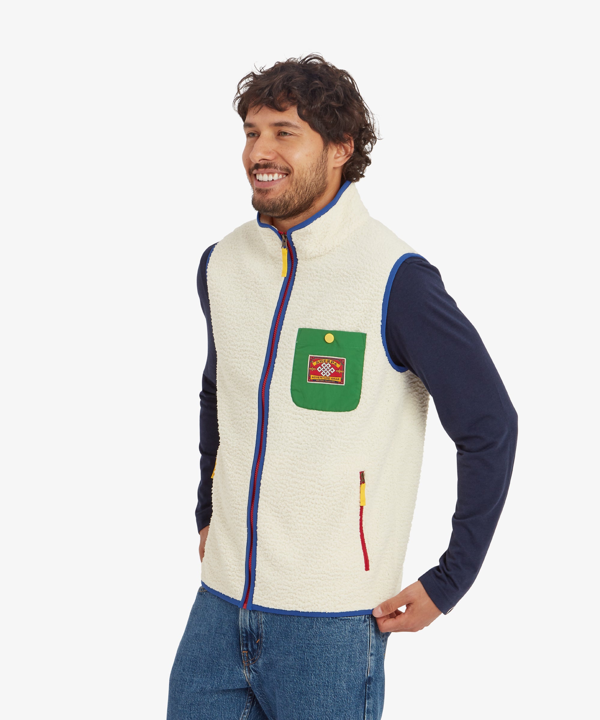 The Tarcho Fleece Vest draws its name and color palette from the colorful Tibetan prayer flags - symbols of peace and compassion that can be found strung across Himalayan Mountain passes. Fabricated from 100% recycled polyester with an anti-pilling finish and moisture-wicking treatment, this is a striking vest ready for any activity. This vest is designed and made in Nepal, and independently certified by OEKO-TEX® to ensure social working conditions and a lighter environmental impact.