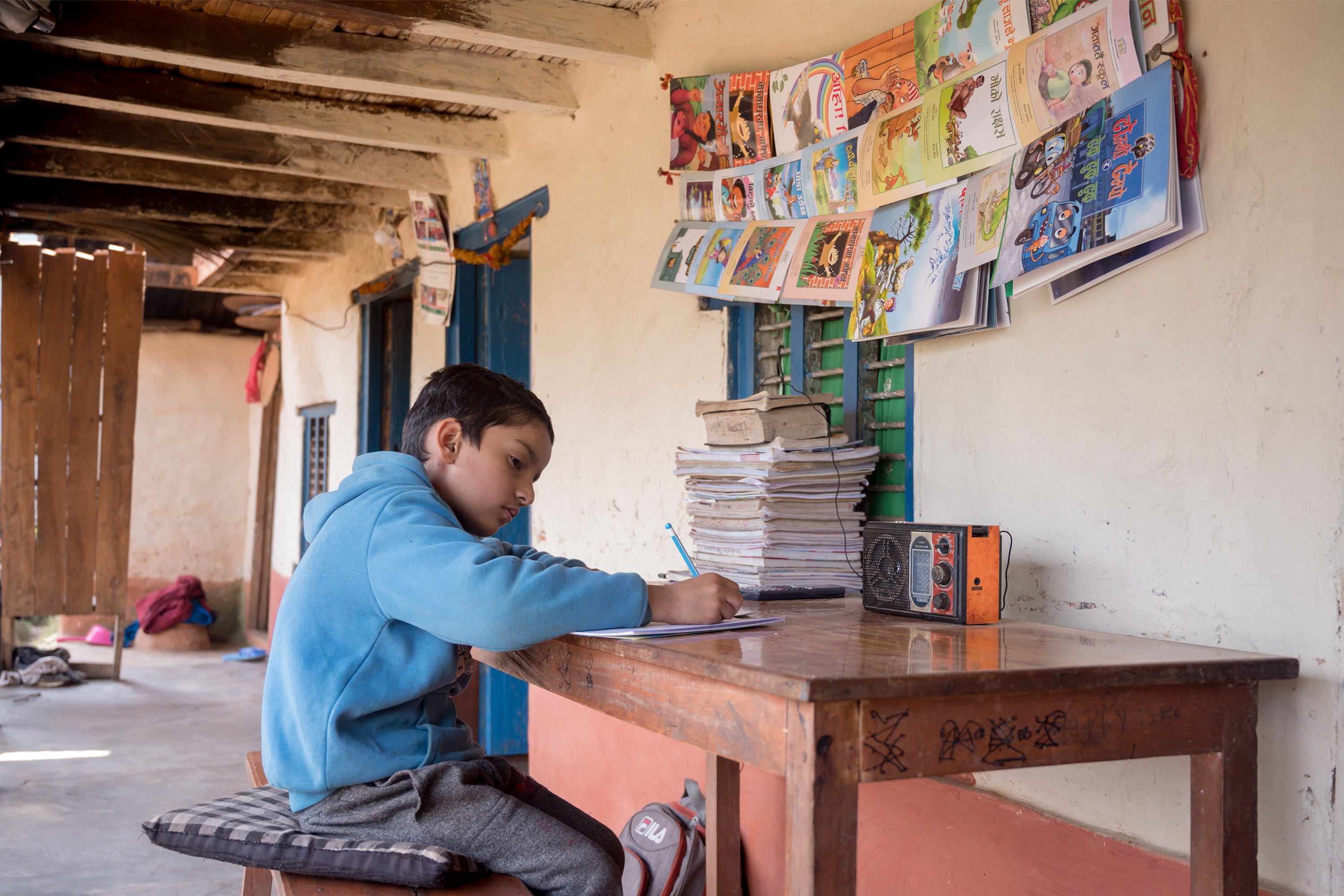 Meet Pratik and his family at home in Nepal. During the pandemic, their home library consisted of colourful children’s books, hung in rows above a large work desk. Pratik’s workbooks and notes could be found stacked neatly beside a radio which played Room to Read’s literacy programming.