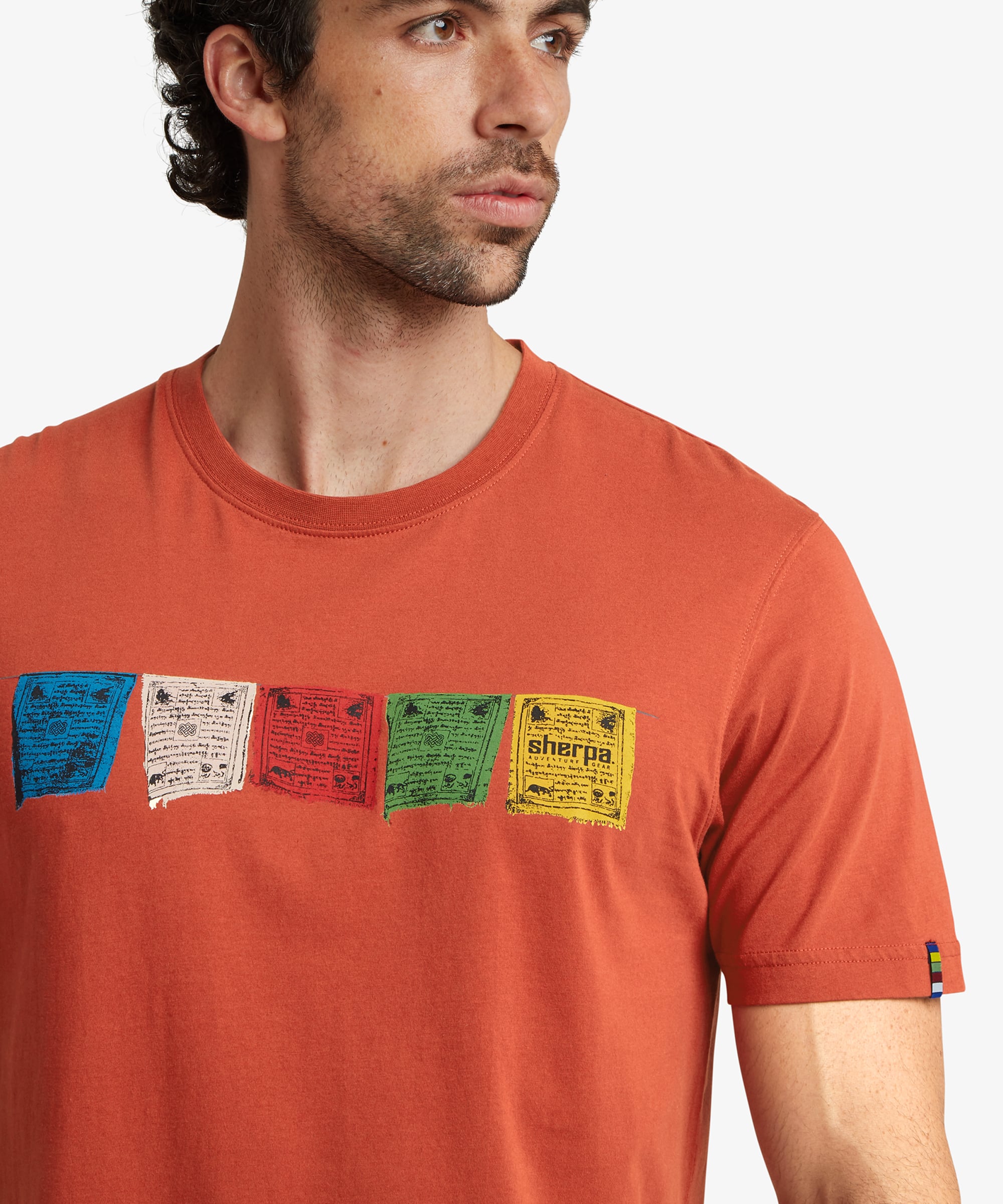 Tarcho is the name given to Tibetan prayer flags - colourful rectangular cloth, often found strung along mountain ridges and peaks high in the Himalayas. The vibrant prayer flags are depicted on the chest of this soft and durable addition to your summer wardrobe. We've also woven prayer flags into the classic crew neck of the tee to prevent it from stretching out of shape. A real dedication to the Tarcho.